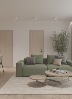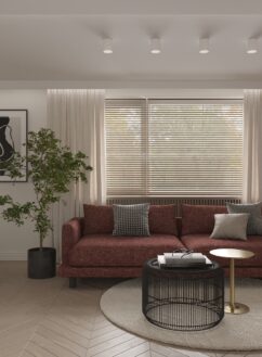 Šis interjeras kurtas jaunai šeimai su dviem vaikais. Siekta suformuoti funkcionalią ir estetiškai darnią aplinką, kurioje kiekvienas šeimos narys jaustųsi patogiai. Pasirinktas tamsenis koloritas su ryškesnių spalvų detalėmis. Bendra svetainės ir virtuvės erdvė tapo namų centru – ji ne tik vizualiai švari, bet ir apgalvotai suplanuota kasdieniam šeimos gyvenimui. Vaikų kambariai individualizuoti spalviniais akcentais, išlaikant žaismingumo ir praktiškumo pusiausvyrą. Miegamojo interjere dominuoja jaukūs tekstilės paviršiai ir minkštos formos. Vonios kambaryje naudotos natūralios tekstūros ir kontrastingi elementai, kuriant šiuolaikinį, bet santūrų įvaizdį. Kiekviena erdvė išnaudota tikslingai, atliepiant šeimos poreikius ir sklandų judėjimą namuose.