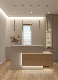 Šis interjeras – tai odontologijos klinika, kurioje siekta sukurti jaukią, šiuolaikišką ir pasitikėjimą keliančią atmosferą.