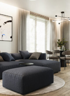 Užsakovės pageidavimu ypatingas dėmesys skirtas jaukumui – tai atsispindi paviršių medžiagiškumo parinkimuose ir ramioje spalvų dermėje.